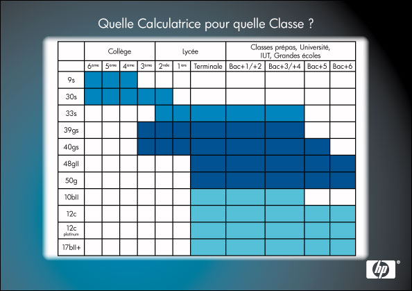 Слева идут номера моделей калькуляторов HP, сверху - классы средней школы и курсы ВУЗа (Франция).