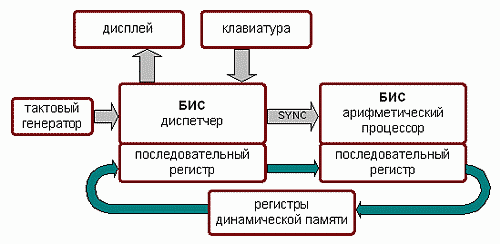 Управляющий контроллер, арифметический процессор и программная память связаны последовательной шиной передачи данных по типу сдвигового регистра. Все узлы тактируются от одного генератора. Такое решение позволяет изменять конфигурацию ЭВМ без коррекции ее микропрограмм.