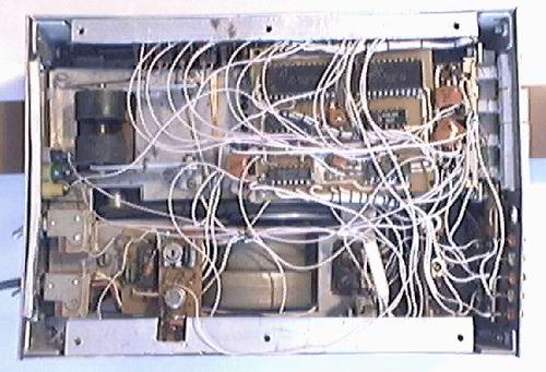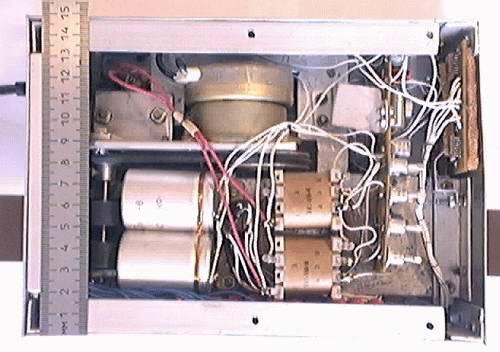 На следующем фото вид считывателя снизу. Слева внизу ведущие ролики протяжки ленты. Правее электролитические конденсаторы блока питания, сетевой трансформатор и плата стабилизаторов напряжения. На передней панели (справа) видна плата цифровой индикации кода команды.