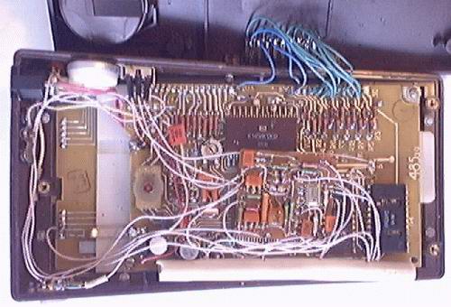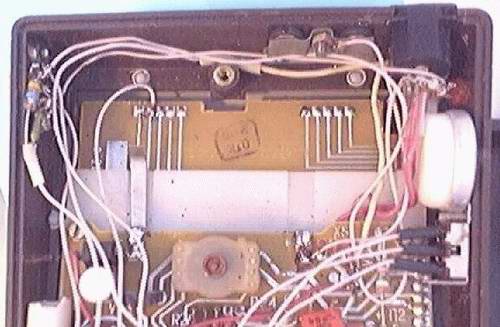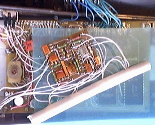 Дополнительная электронная схема представляет собой управляемые одновибраторы и звуковой генератор. Она смонтирована на односторонней печатной плате. Крупногабаритные элементы (конденсаторы) размещены в белом кембрике, он в нижней части рисунка.