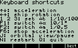 - Стрелки вверх и вниз служат для управления ускорением. Одно нажатие клавиши соответствует изменению ускорения на 1 м/сек2. Клавишей "F2" для более точного манёвра можно изменять приращение с 1 до 0,5 м/сек2 и обратно. Клавишей "F6" можно мгновенно выключить двигатель.