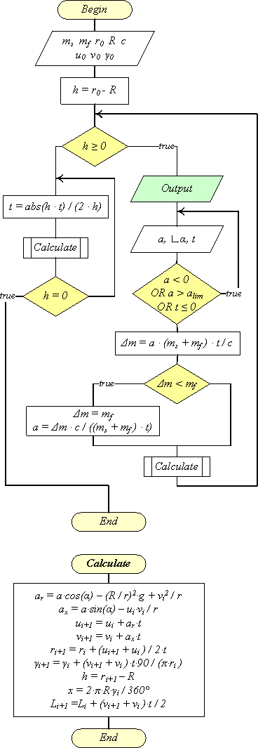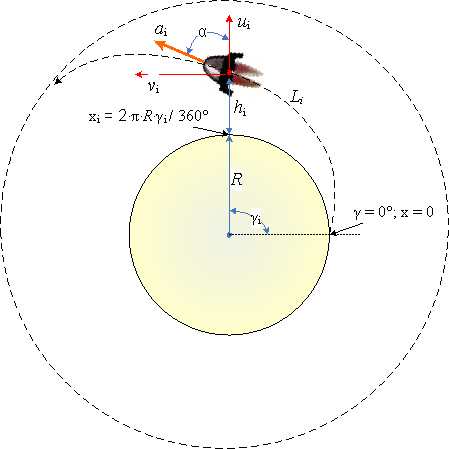 Движение лунолёта характеризуется вертикальной "u" и горизонтальной "v" скоростями, тяга определяется вектором ускорения "a", угол "альфа" которого задаётся как отклонение от вертикали (прямая между лунолётом и центром планеты). Местонахождение определяется расстоянием "r" от центра планеты (высота "h" является разностью этого расстояния и радиуса планеты) и углом отклонения "гамма" от места старта "гамма-ноль". Как вы могли заметить, мы перешли к расчетам в полярной системе координат. Пройденная дистанция "L" рассчитывается как сумма пройденных участков пути (наш симулятор рассчитывает манёвр ежесекундно)
