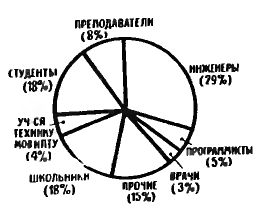 Тем интереснее было обнаружить сведения о структуре пользователей калькуляторов в эпоху, когда персональный компьютер был доступен относительно зажиточным гражданам (стоимость БК-0010 составляла 700 руб, примерно пятимесячная зарплата молодого инженера).