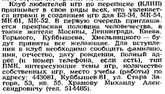 От редакции. В декабре нынешнего года исполняется 25 лет со дня основания КЛИП - Клуба Любителей Игр по Переписке, вскоре ставшего просто Клубом Любителей Игровых Программ. В 1989-1994 годах это неформальная организация объединила (без интернета и даже без электронной почты) многие сотни владельцев программируемых калькуляторов по всему СССР. Кроме собственно обмена программами между участниками клуба, был собран крупнейший в стране банк программ, издавался печатный бюллетень, некоторые материалы были опубликованы в СМИ (журналах) того времени.